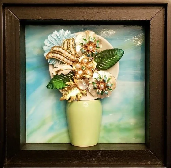 By using vintage materials, she is able to integrate her passion for florals with her love of art, antiques, collecting, and upcycling. She especially enjoys using objects that remind the viewer of their personal history or relationships, such as an antique frame, a mother’s china pattern, or a favorite piece of jewelry.